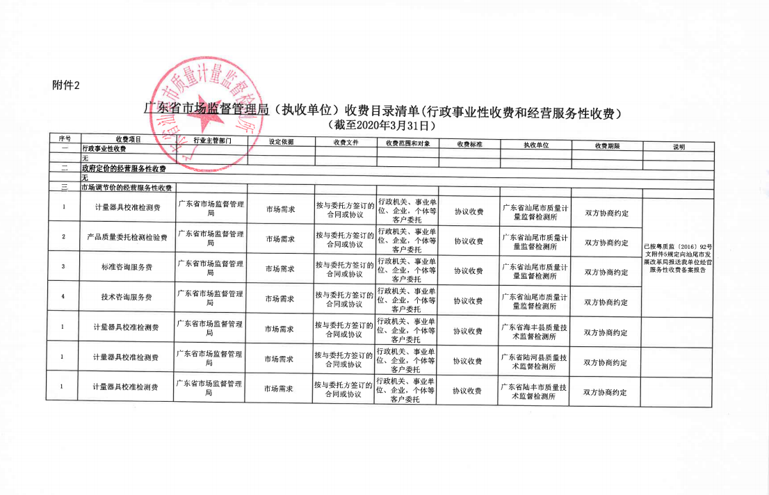 广东省汕尾市质量计量监督检测所及所辖县所收费目录清单(经营服务性收费)