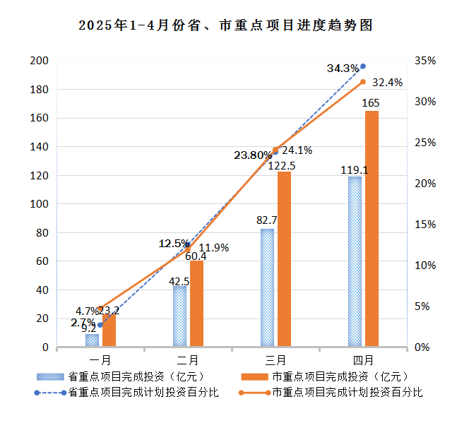 汕尾市2025年重点建设项目330项,项目总投资4515.49亿元,年度计划投资508.72亿元,截至4月底,累计完成投资165亿元,完成年度投资计划的32.4%。我市列入2025年省重点建设项目66项,项目总投资2635.6亿元,年度计划投资347亿元,截至4月底,累计完成投资119.1亿元,完成年度投资计划的34.3%。