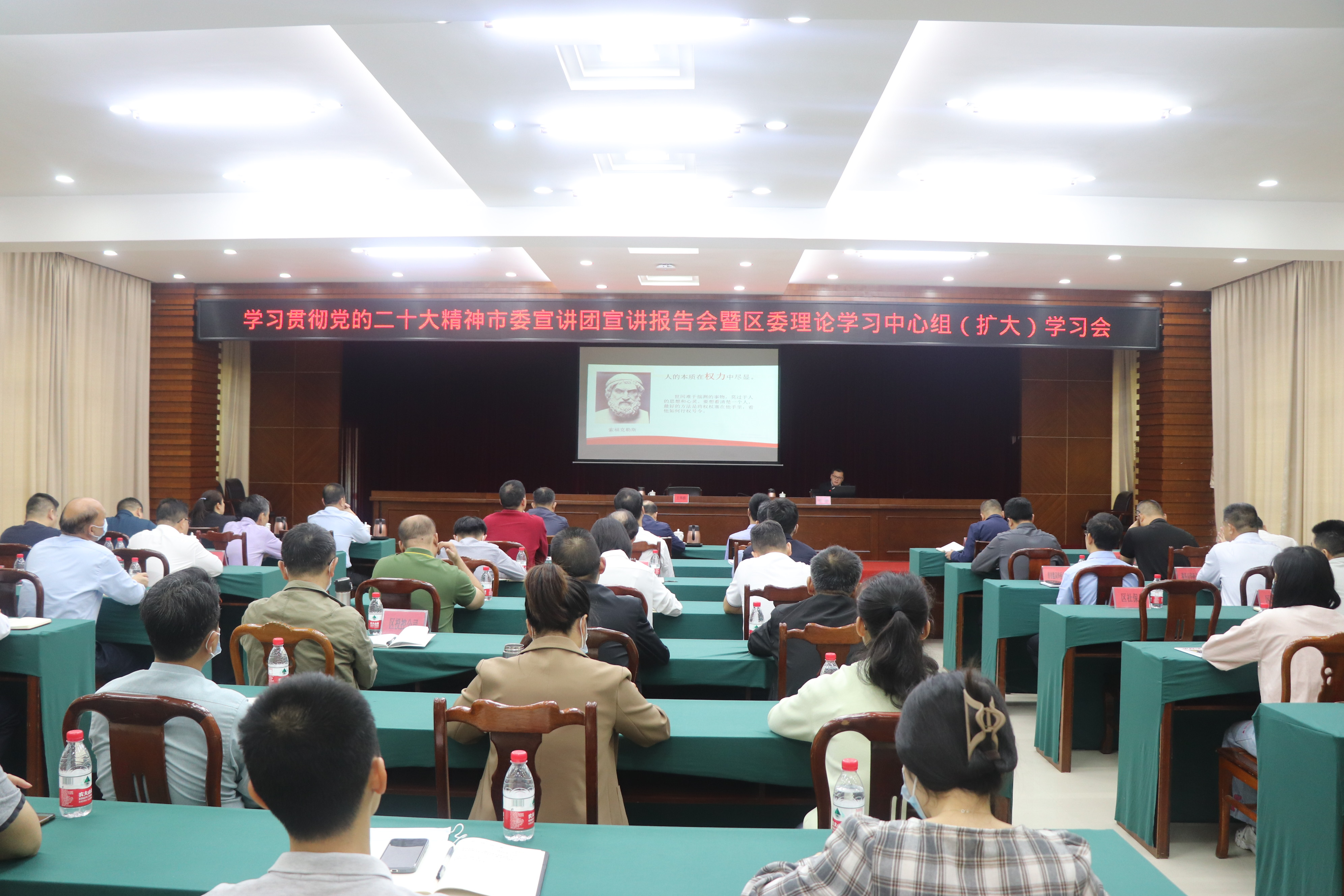 4月13日,我区召开学习贯彻党的二十大精神市委宣讲团宣讲报告会暨区委理论学习中心组(扩大)学习会。区委书记、区管委会主任王伟群主持会议,市委宣讲团成员张路老师作专题辅导报告。