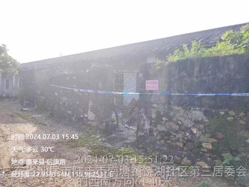 2024年7月3日,经社区网格员巡查,第三社区东片五巷一排,系无人居住的老旧危房,由于年久失修,近期降雨量交大,房顶经常有瓦片滑落现象,对路人过往安全隐患存在威胁,网格员立即上报社区领导,组织工作人员第一时间将该危房拉上警戒线,并贴上提示标语,提醒附近的居民群众不要靠近危险该危房墙体,防止意外发生。