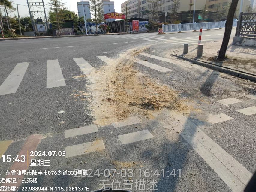 2024年7月3日,经巡查发现第二社区侨惠路段,有车载黄泥土沿途洒落在转弯路口上,存在行车安全隐患,影响市容市貌,网格员、社区干部现场了解情况后组织工作人员及时清理了路面,恢复路面干净整洁,消除了隐患,避免了危及道路行车安全。