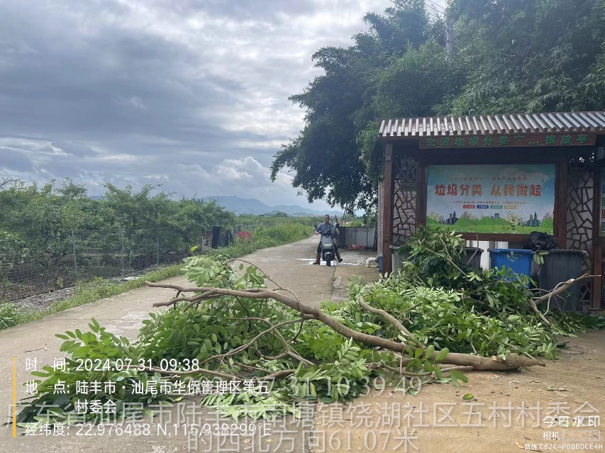2024年7月31日,经巡查发现,第五村委傅厝寮村,树枝被堆放在垃圾桶旁。网格员立即前往查看情况,经了解因台风大雨天气,树枝断裂村民帮忙将断裂树枝堆放在垃圾桶旁,由于垃圾车无法装车运走,导致长时间堆放在原地。网格员与村委工作人员联系相关部门负责人,现已经处理完成。