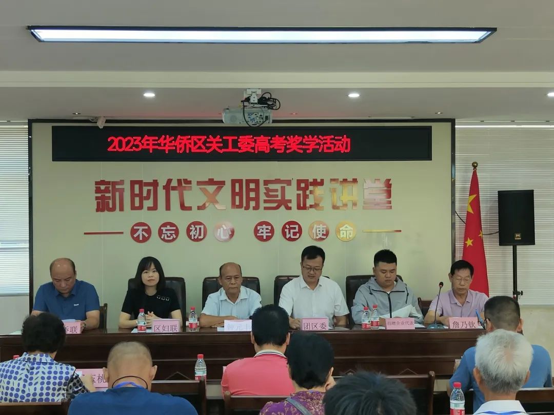 8月22日上午,我区在新时代文明实践中心举行2023年华侨区关工委高考奖学活动,仪式由区关工委副主任詹乃钦同志主持。渤海筑梦教育基金会、区关工委、区侨联、区妇联、区总工会、团区委、区教育与卫生健康局、华侨中学等单位代表,2023年度华侨中学高考总分前五名学生以及班主任参加发放仪式。