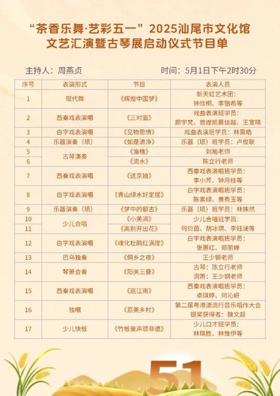 值此五一假期,汕尾市文化馆精心策划“茶香乐舞·艺彩五一”2025汕尾市文化馆文艺汇演暨古琴展启动仪式,