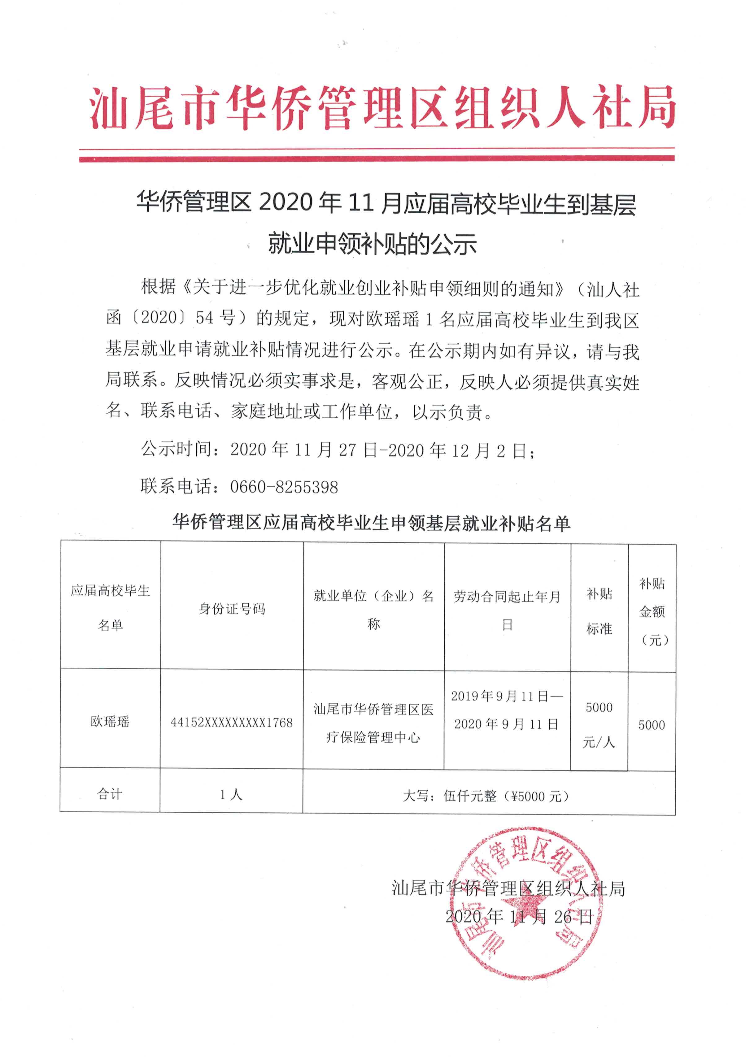 华侨管理区2020年11月应届高校毕业生到基层就业申领补贴的公示