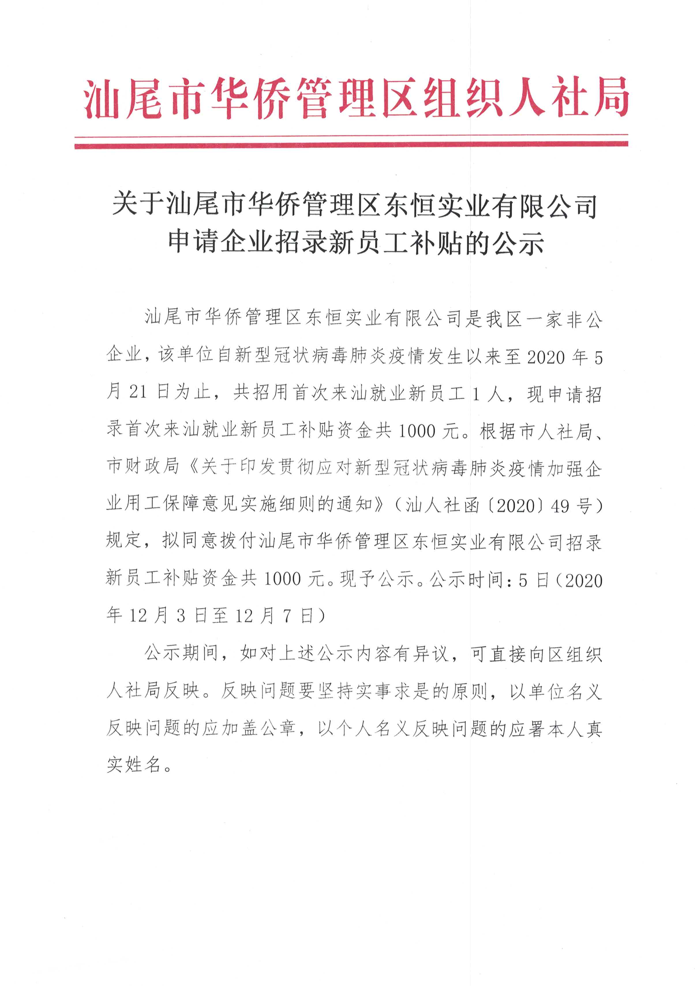 关于汕尾市华侨管理区东恒实业有限公司申请企业招录新员工补贴的公示-ag尊龙凯时