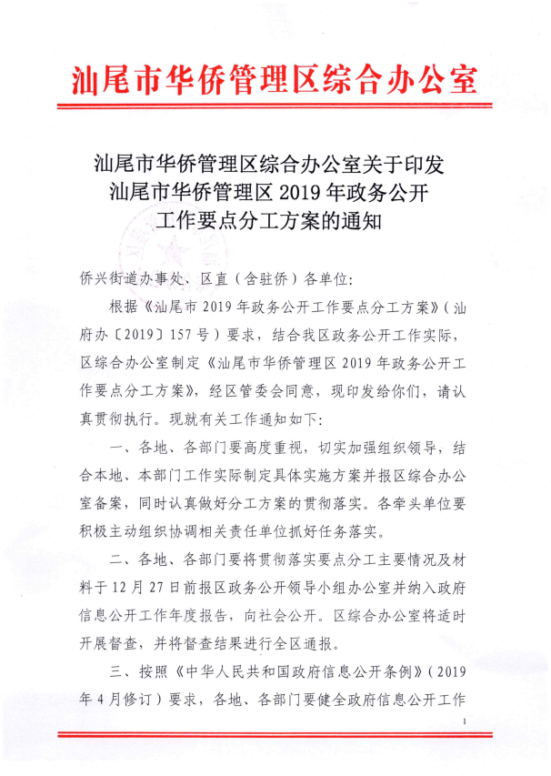 汕尾市华侨管理区综合办公室关于印发汕尾市华侨管理区2019年政务公开工作要点分工方案的通知