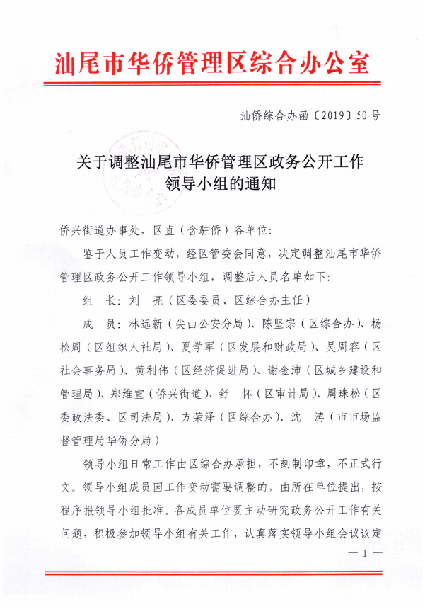 关于调整汕尾市华侨管理区政务公开工作领导小组的通知